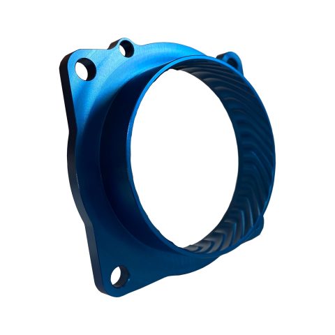 The Powr-Flo spacers bore is designed to increase the velocity of the air flow into the intake manifold .By delivering the air with more velocity it allows more air into the combustion chamber for a denser air charge. The design results in improved throttle response and impressive power gains in the mid range and top end. In addition, the increased air flow results in improved overall fuel efficiency. Simple, bolt-on installation with no other vehicle modifications required. Compatible with other aftermarket upgrades such as computer upgrades, cold air intakes, free flow exhaust systems, etc. Precision machined out of billet aluminum by JET’s in house CNC machine shop.