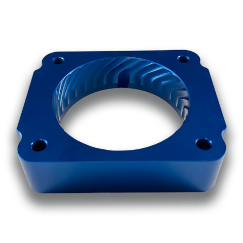 The Powr-Flo spacers bore is designed to increase the velocity of the air flow into the intake manifold .By delivering the air with more velocity it allows more air into the combustion chamber for a denser air charge. The design results in improved throttle response and impressive power gains in the mid range and top end. In addition, the increased air flow results in improved overall fuel efficiency. Simple, bolt-on installation with no other vehicle modifications required. Compatible with other aftermarket upgrades such as computer upgrades, cold air intakes, free flow exhaust systems, etc. Precision machined out of billet aluminum by JET’s in house CNC machine shop.