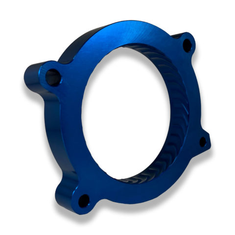 The Powr-Flo spacers bore is designed to increase the velocity of the air flow into the intake manifold .By delivering the air with more velocity it allows more air into the combustion chamber for a denser air charge. The design results in improved throttle response and impressive power gains in the mid range and top end. In addition, the increased air flow results in improved overall fuel efficiency. Simple, bolt-on installation with no other vehicle modifications required. Compatible with other aftermarket upgrades such as computer upgrades, cold air intakes, free flow exhaust systems, etc. Precision machined out of billet aluminum by JET’s in house CNC machine shop.
